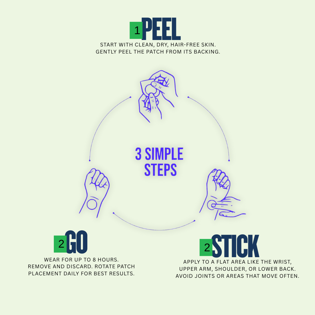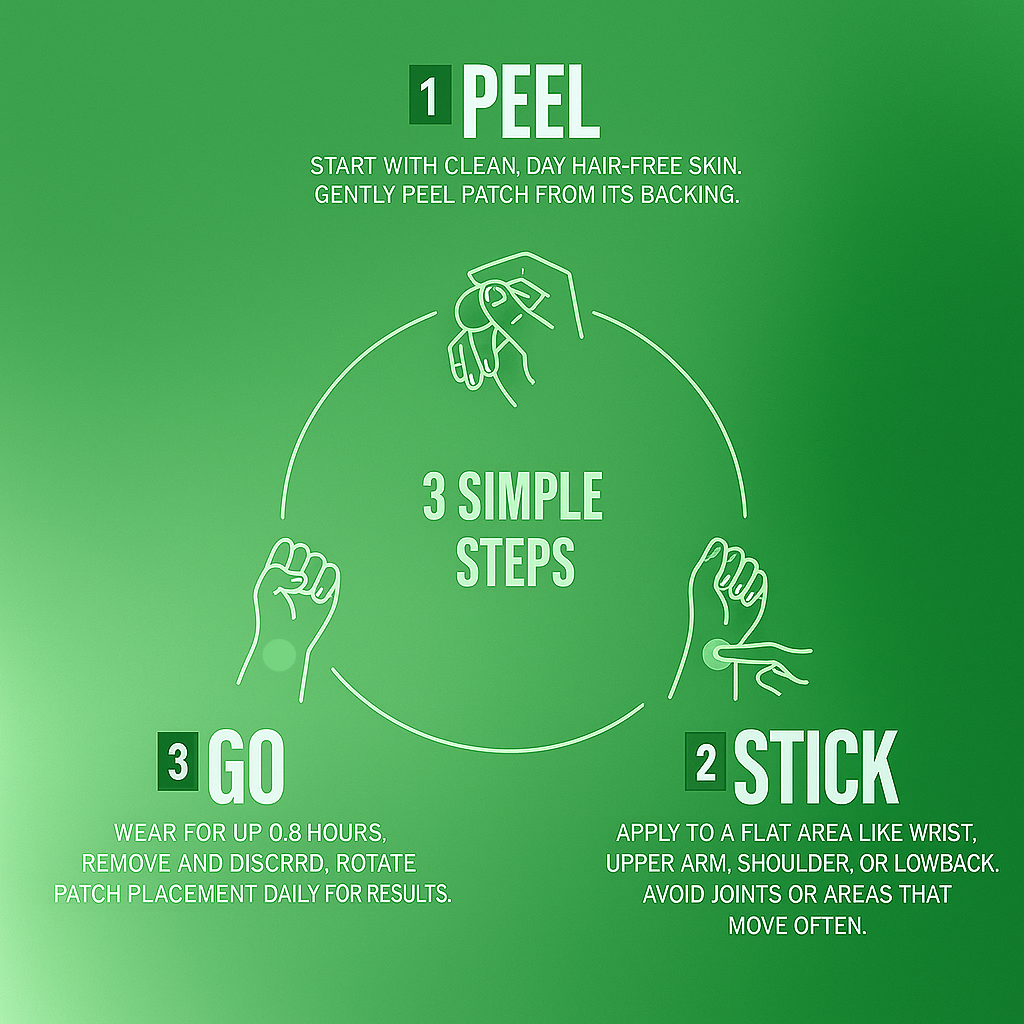 For external use only. Use one patch at a time and do not reuse patches. Once opened, apply promptly. Keep out of reach of children. Do not apply to wounds, broken, or sensitive skin, and avoid eye contact. Wash hands thoroughly after application. Discontinue use if irritation or allergic reactions occur and consult a healthcare professional. Do not use if pregnant, nursing, or taking medication without medical advice.